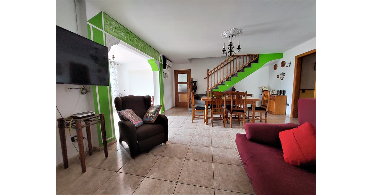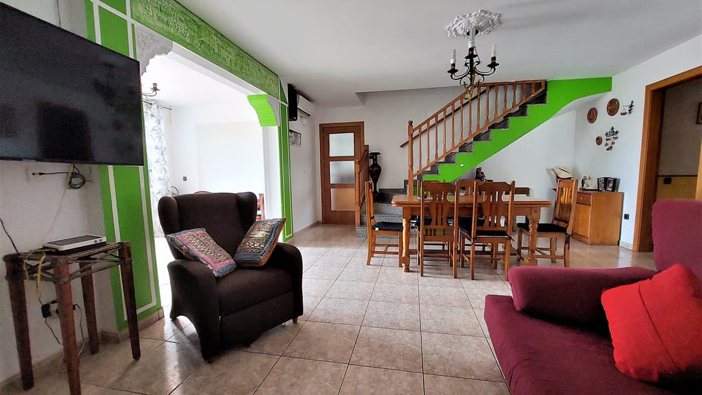 Accedim a la casa pel porxo, i trobem un gran salon menjador amb xemeneia , aportant una sala molt confortable i càlida, grans finestrals amb sortida a la terrassa d'aquesta primera planta i molta lluminositat.