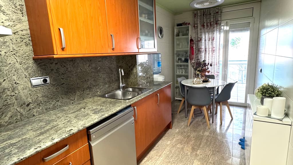 Just al costat , trobem la cuina office, amb molt bon espai de treball , zona de magatzematge , i amb espai diferenciat per a taula i cadires i també sortida al mateix balcon de la façana principal.