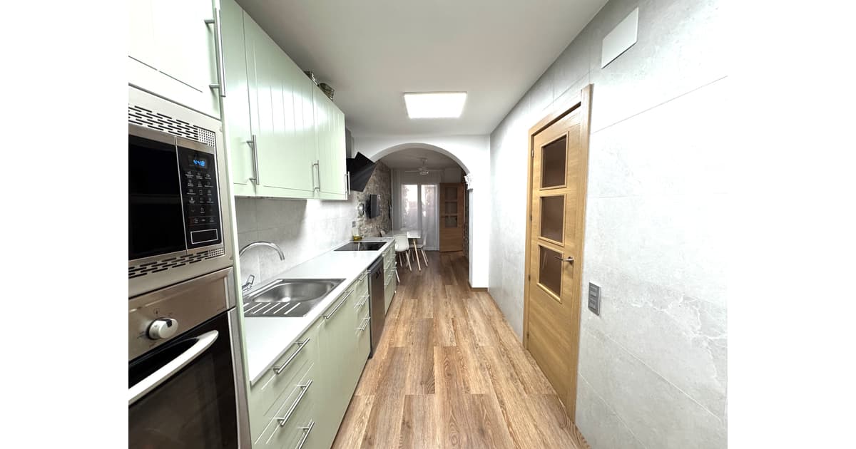 Entrem a la cuina, totalment reformada , molt bona zona de treball i amb espai suficient per a poder fer vida en ella. Una cuina moderna, practica, i molt lluminosa. Des d'ella tenim accés a un pati, actualment destinat per a zona de bugaderia i una altra estada destinada a zona de magatzematge i rebost.