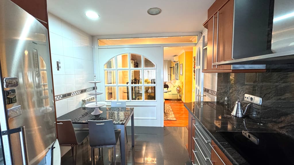 Arribem a la cuina office, totalment equipada, reformada amb un gust exquisit i amb molt bona zona de treball i espacihabilitat per a taula i cadires i fer vida en ella. Una porta de fusta lacada blanca i un finestral de cristall , ens ensenya el salonmenjador de l'habitatge.