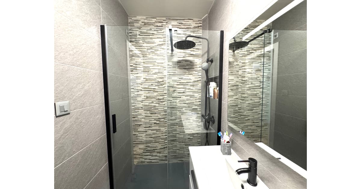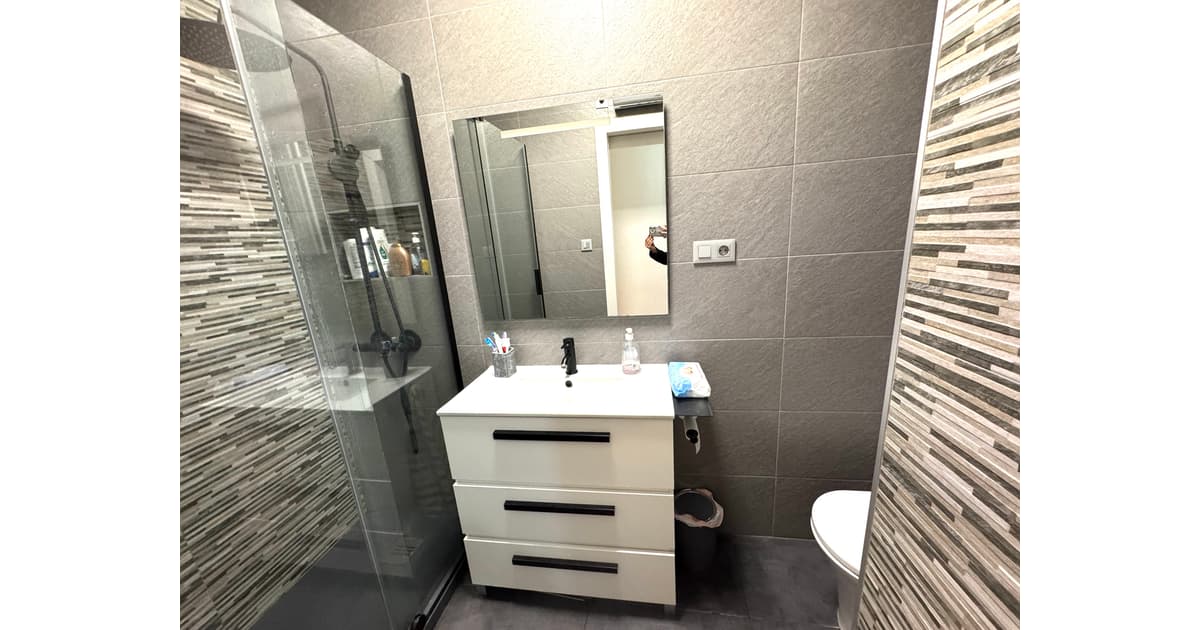 El bany de l'habitatge, totalment reformat, molt modern i actual i amb plat de dutxa i mampara de cristall.