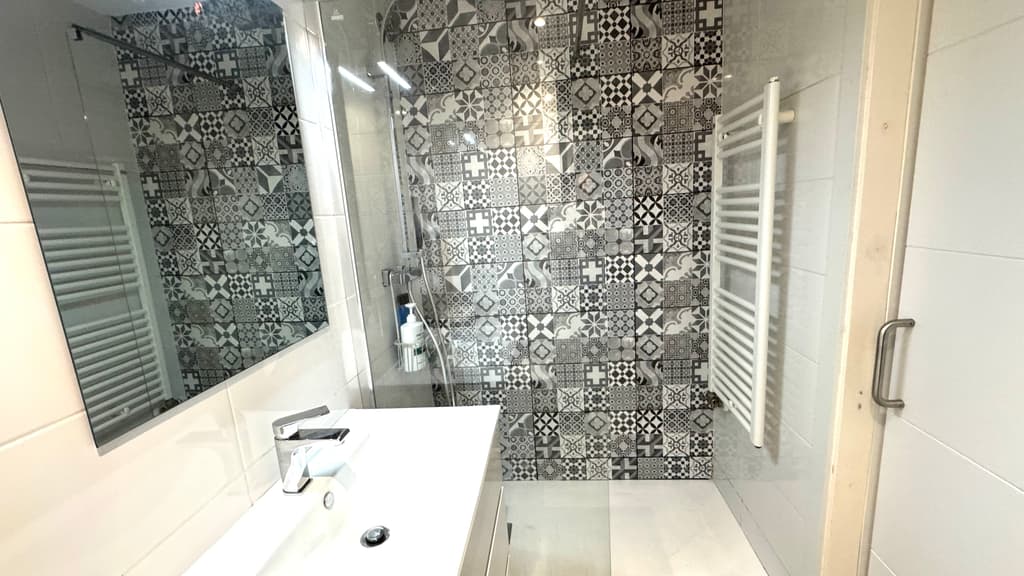 El bany, complet, reformat i molt actual i amb plat de dutxa amb mampara de cristall i zona habilitada per a rentadora i assecadora.