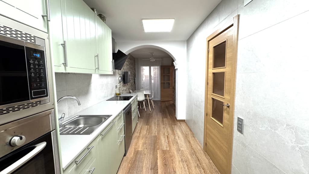Entrem a la cuina, totalment reformada , molt bona zona de treball i amb espai suficient per a poder fer vida en ella. Una cuina moderna, practica, i molt lluminosa. Des d'ella tenim accés a un pati, actualment destinat per a zona de bugaderia i una altra estada destinada a zona de magatzematge i rebost.