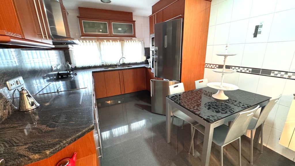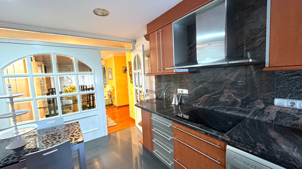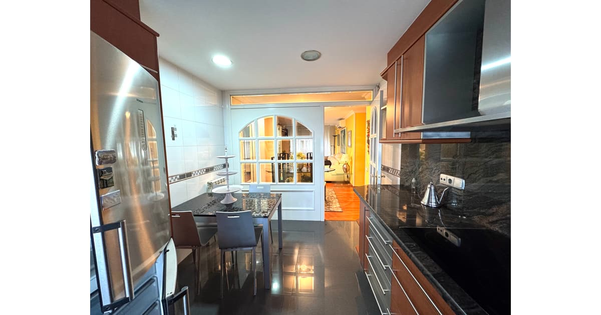 Arribem a la cuina office, totalment equipada, reformada amb un gust exquisit i amb molt bona zona de treball i espacihabilitat per a taula i cadires i fer vida en ella. Una porta de fusta lacada blanca i un finestral de cristall , ens ensenya el salonmenjador de l'habitatge.
