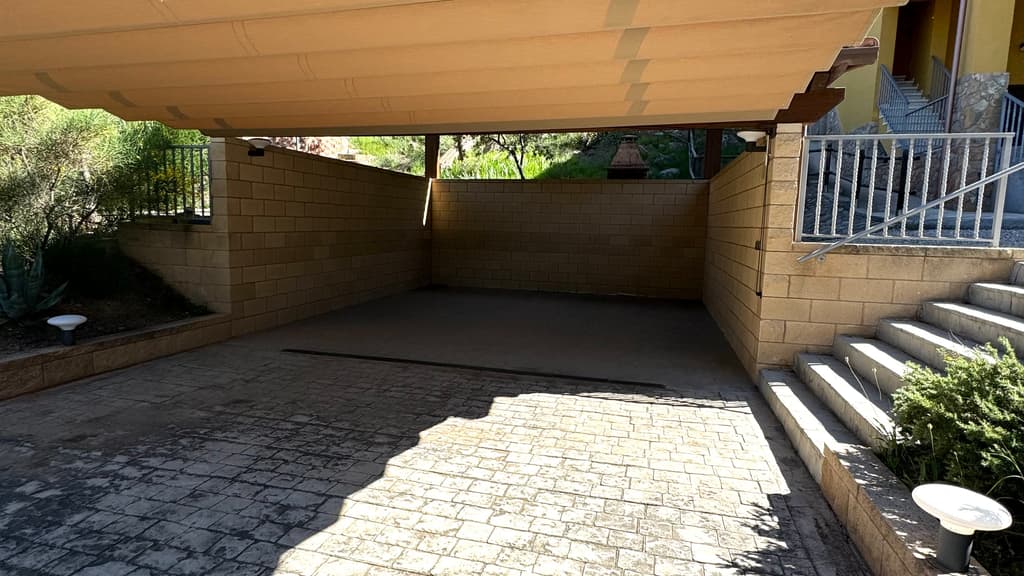 La part exterior, consta d'un garatge, amb sostre de fusta, amb capacitat maxima per a 4 cotxes.
