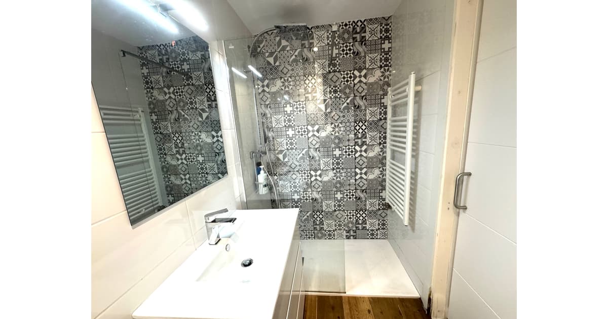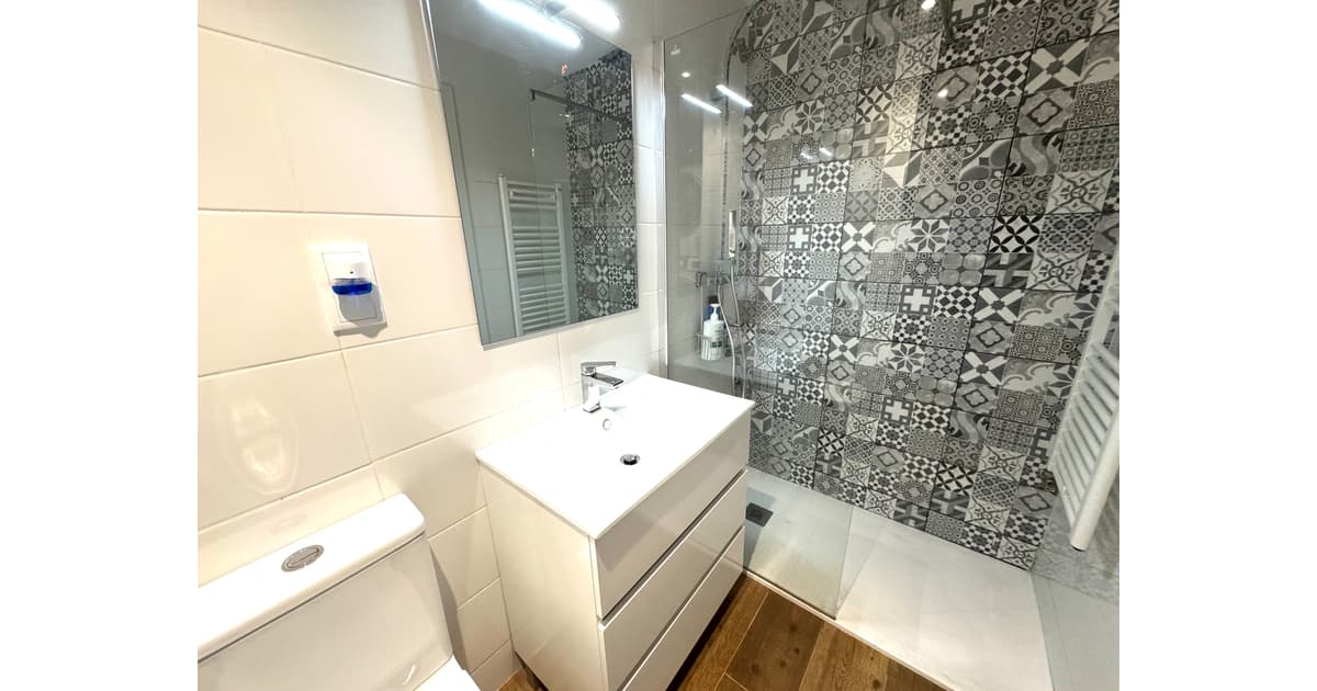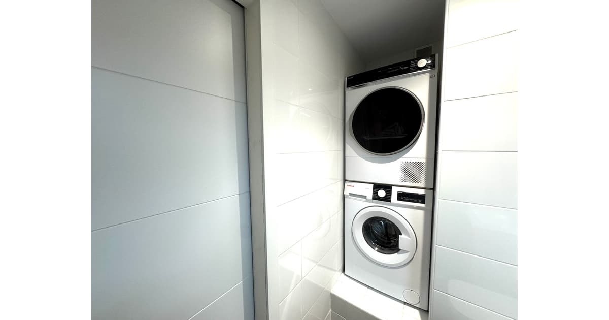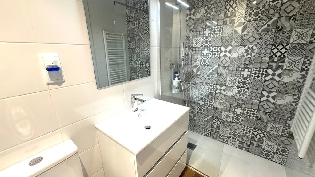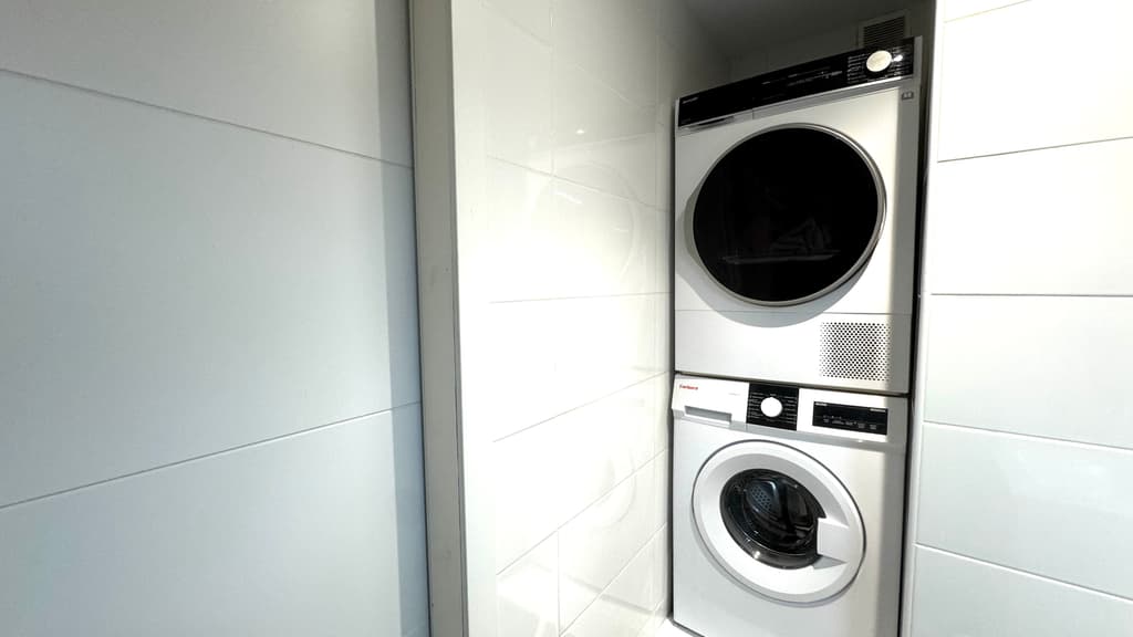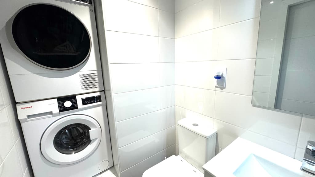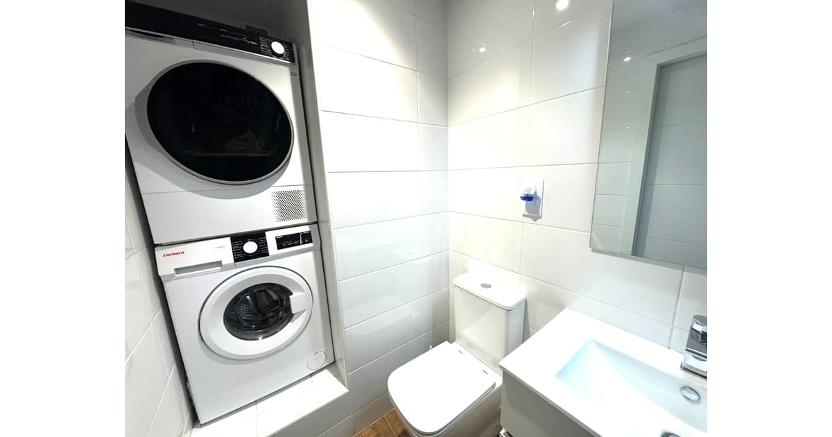 El bany, complet, reformat i molt actual i amb plat de dutxa amb mampara de cristall i zona habilitada per a rentadora i assecadora.