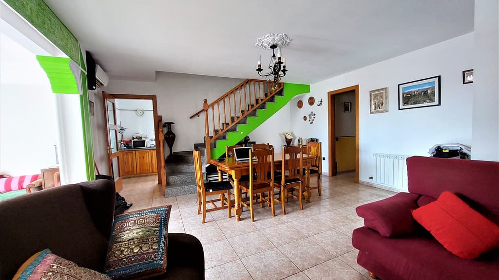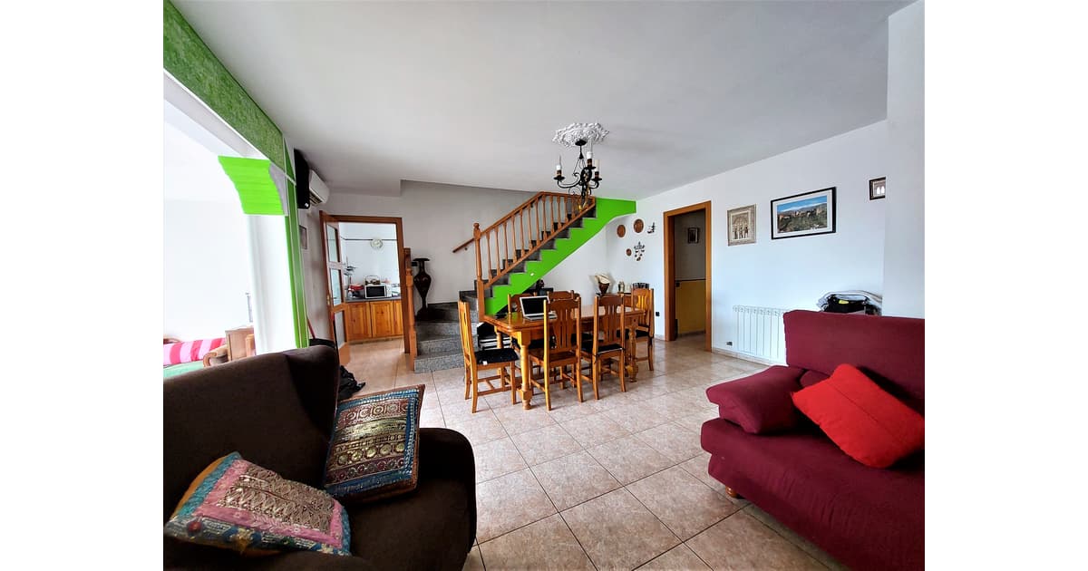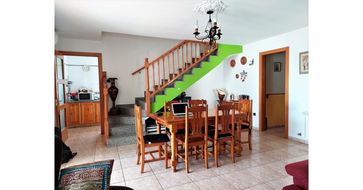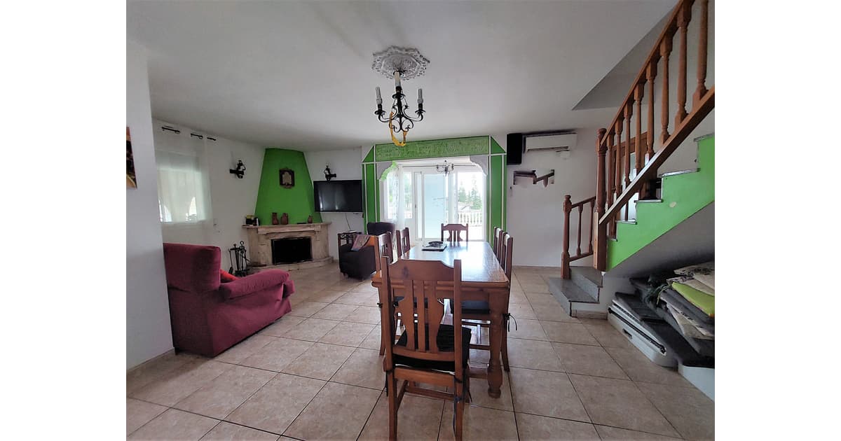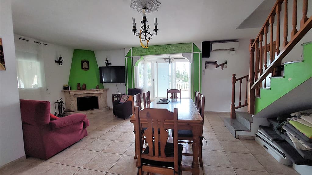 Accedemos a la casa por el porche, y encontramos un gran salon comedor con chimenea , aportando una sala muy confortable y cálida, grandes ventanales con salida a la terraza de esta primera planta y mucha luminosidad.