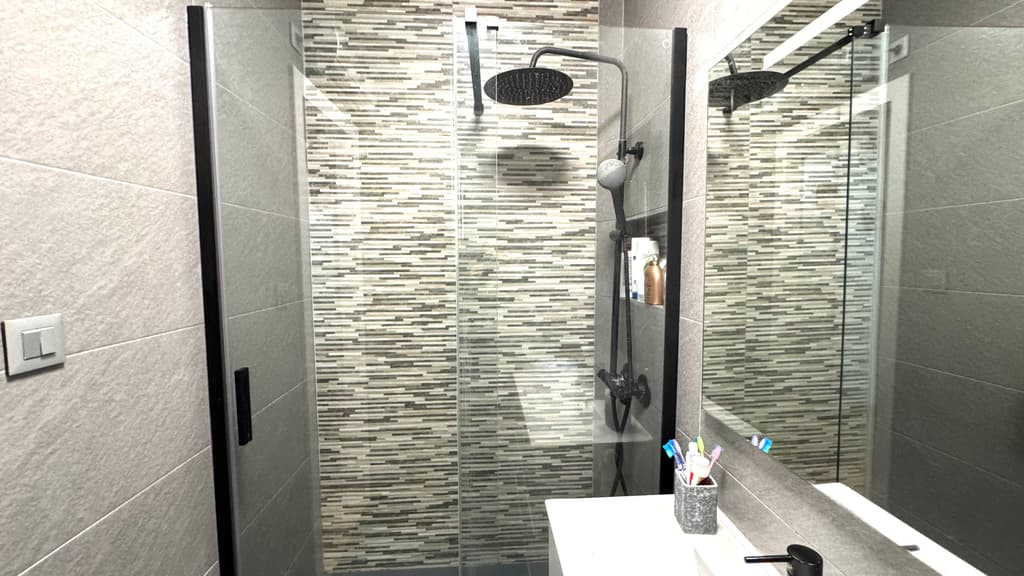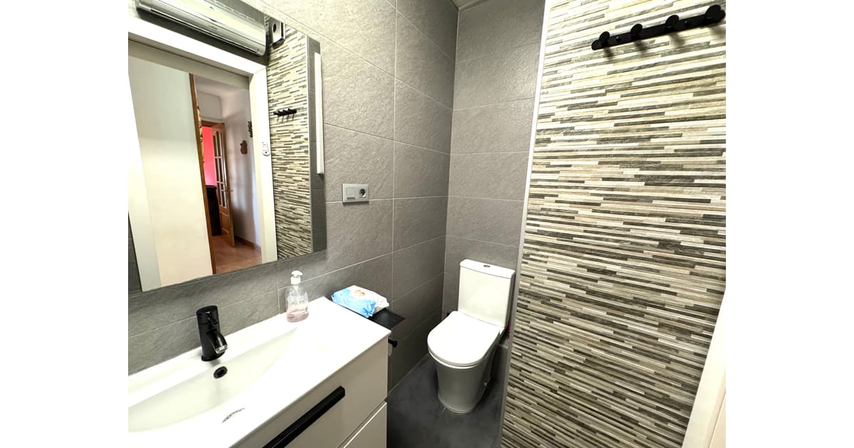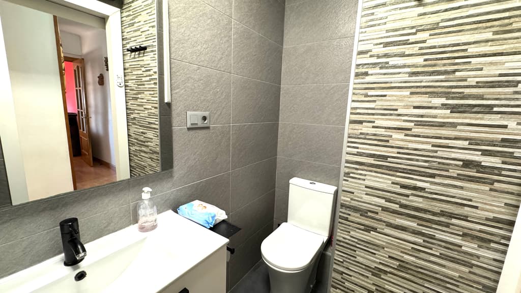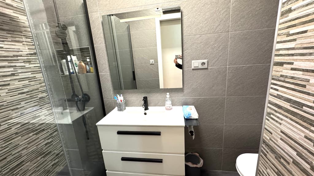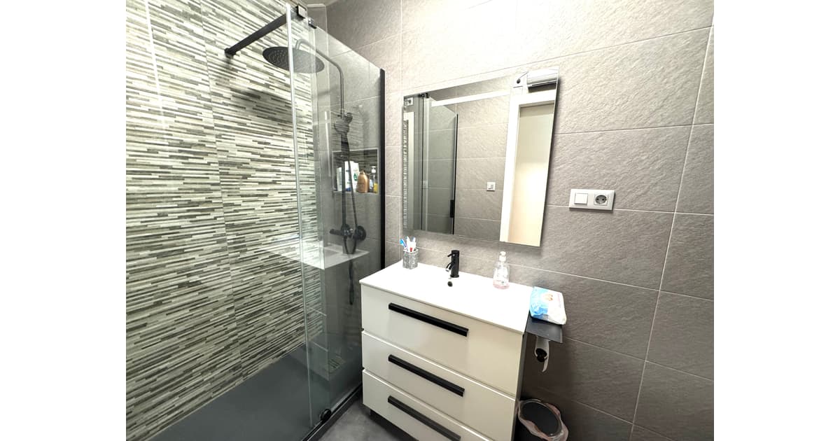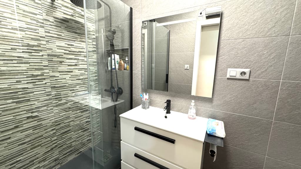 El baño de la vivienda, totalmente reformado, muy moderno y actual y con plato de ducha y mampara de cristal.