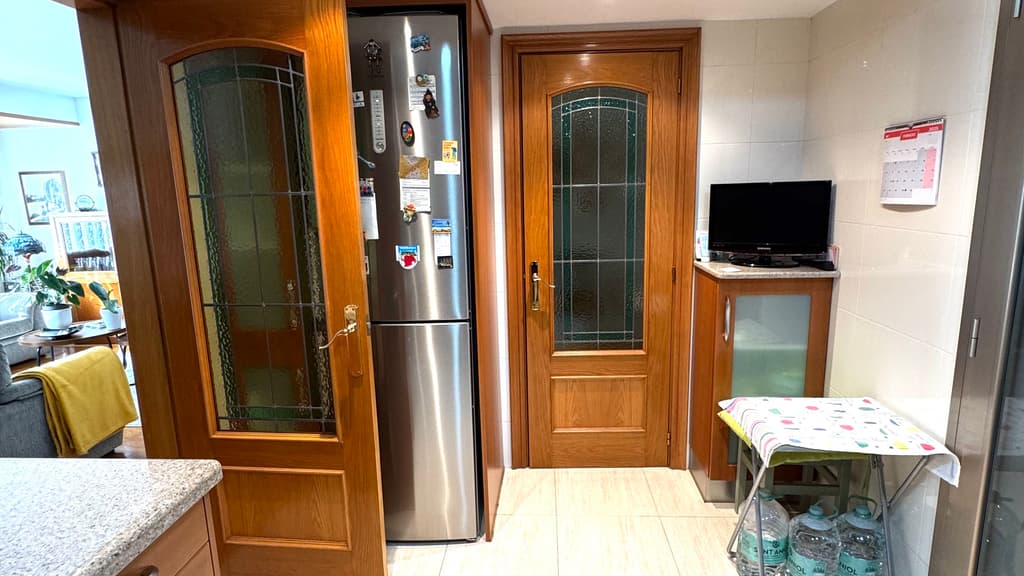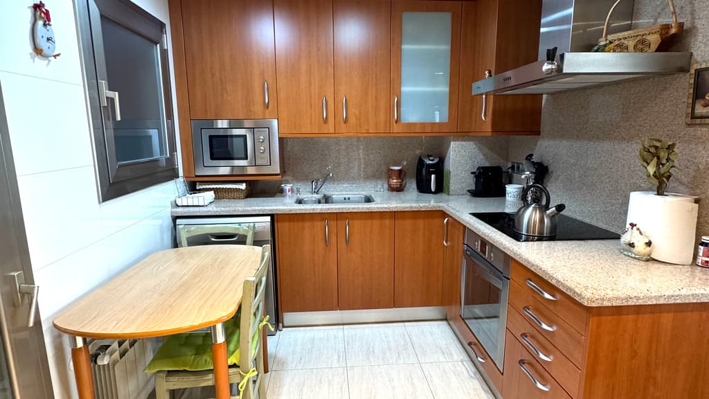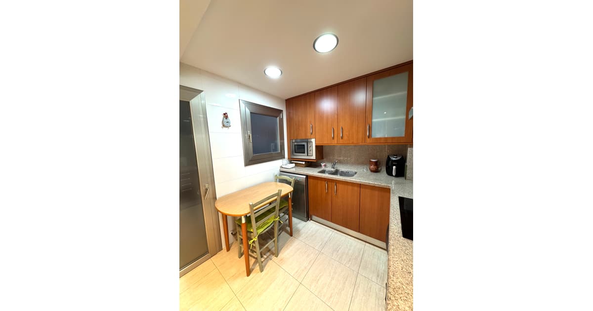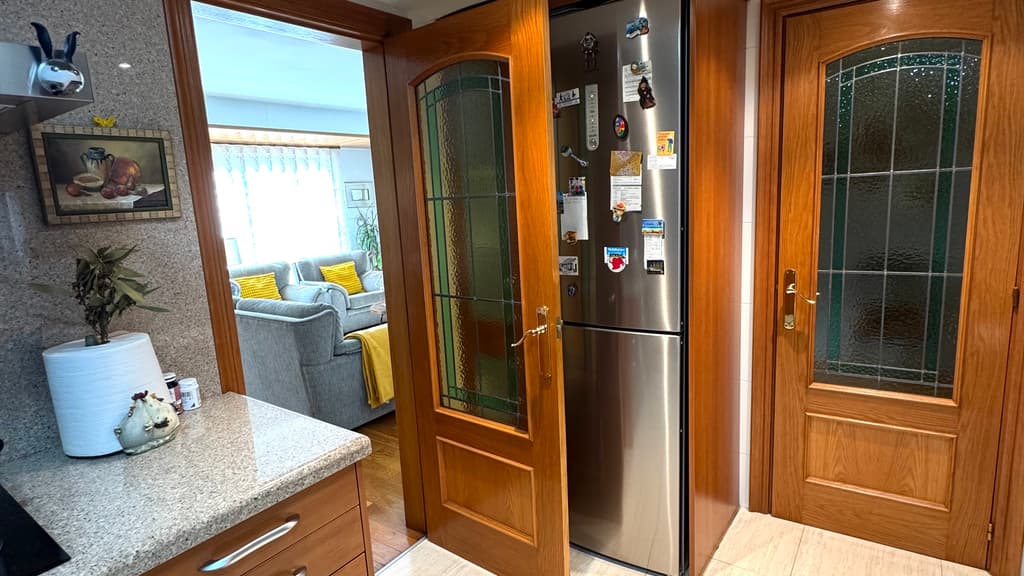 A tocar tenemos una magnífica cocina reformada, con mobiliario muy actual y gran capacidad de almacenaje. Dispone de entrada a la cocina, desde el recibidor y desde el comedor.