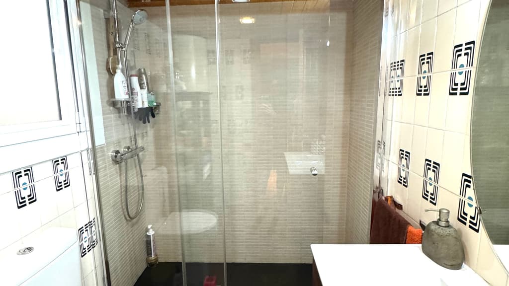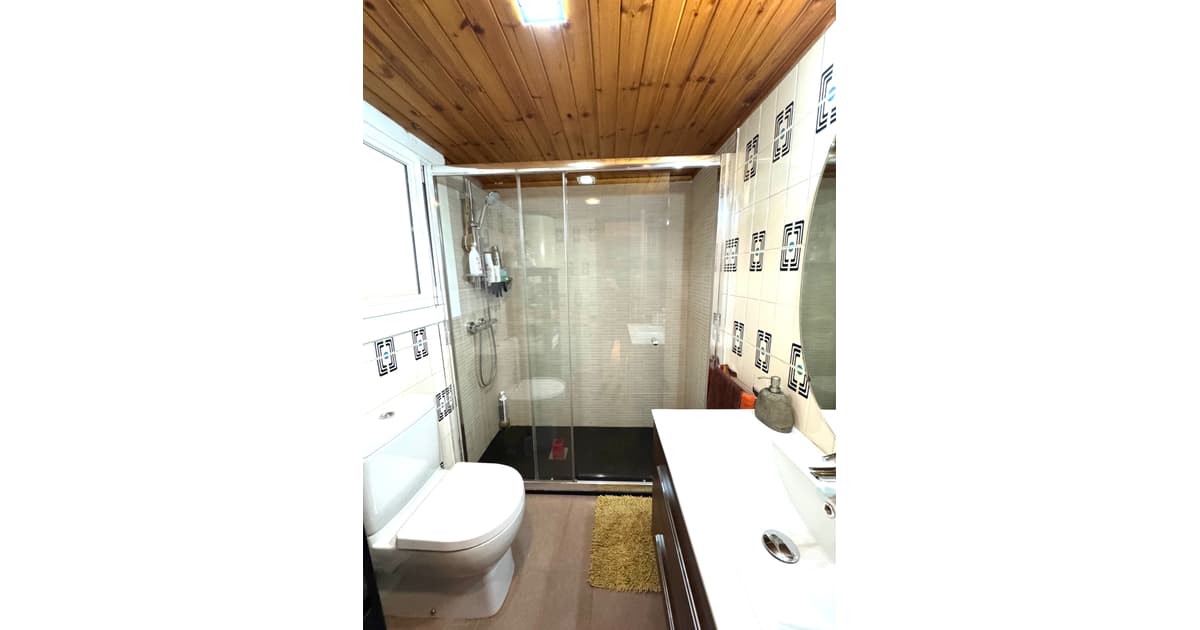 Justo al lado encontramos el baño principal , con plato de ducha y mampara de cristal , techo de madera y con ventana para poder ventilar.